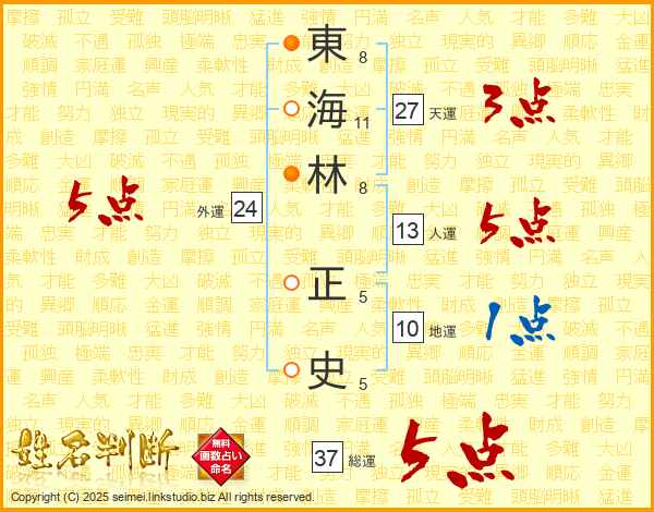 東(8画)海(11画)林(8画) 正(5画)史(5画)