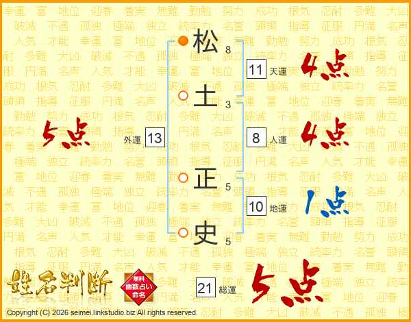 あなたの人生を表す1番重要な運勢です。生涯を通じて影響する総合運となり、主に50歳以降の晩年期に影響を及ぼします。苗字と名前の合計画数。