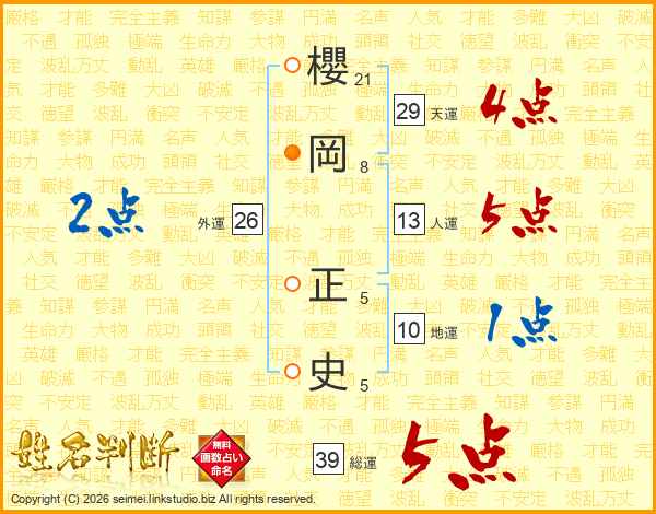 櫻岡正史さんの総運は39画の5点!