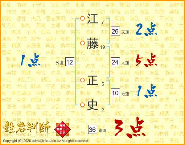 あなたの人生を表す1番重要な運勢です。生涯を通じて影響する総合運となり、主に50歳以降の晩年期に影響を及ぼします。苗字と名前の合計画数。