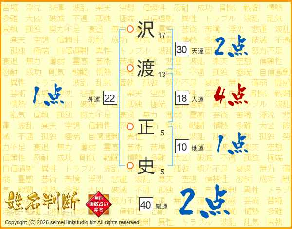 あなたの人生を表す1番重要な運勢です。生涯を通じて影響する総合運となり、主に50歳以降の晩年期に影響を及ぼします。苗字と名前の合計画数。