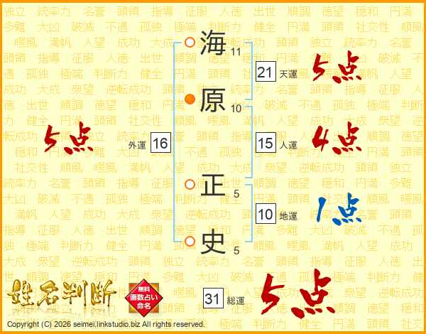 あなたの人生を表す1番重要な運勢です。生涯を通じて影響する総合運となり、主に50歳以降の晩年期に影響を及ぼします。苗字と名前の合計画数。
