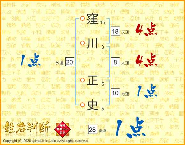 生活面を象徴する運勢です。外部から受ける影響力を表し、結婚運、家庭運や職場、環境への順応性を表します。総運から人運を引いた画数。姓や名が1文字の場合を除く。