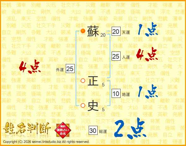 あなたの人生を表す1番重要な運勢です。生涯を通じて影響する総合運となり、主に50歳以降の晩年期に影響を及ぼします。苗字と名前の合計画数。
