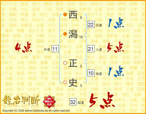 あなたの人生を表す1番重要な運勢です。生涯を通じて影響する総合運となり、主に50歳以降の晩年期に影響を及ぼします。苗字と名前の合計画数。