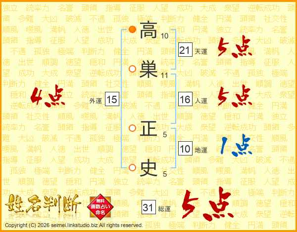 あなたの人生を表す1番重要な運勢です。生涯を通じて影響する総合運となり、主に50歳以降の晩年期に影響を及ぼします。苗字と名前の合計画数。