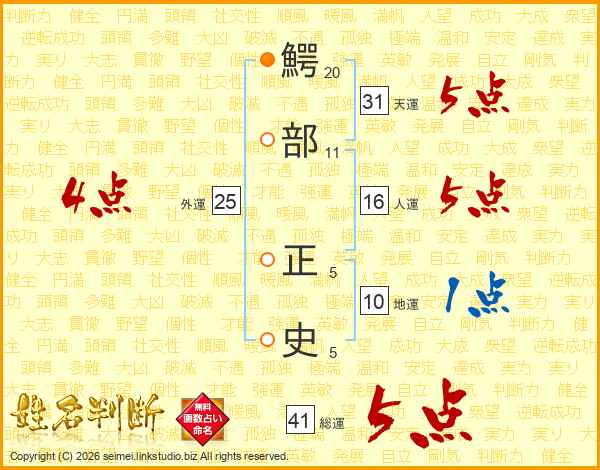 画数の奇数(○陽)と偶数(●陰)の配列で吉凶を占います。どちらかにかたよる名前は大凶名で避ける必要があります。画数の奇数偶数。