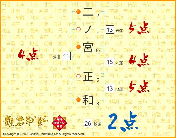 生活面を象徴する運勢です。外部から受ける影響力を表し、結婚運、家庭運や職場、環境への順応性を表します。総運から人運を引いた画数。姓や名が1文字の場合を除く。