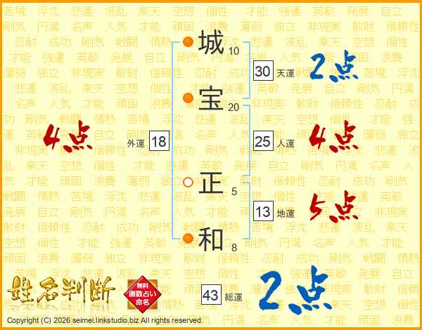 生活面を象徴する運勢です。外部から受ける影響力を表し、結婚運、家庭運や職場、環境への順応性を表します。総運から人運を引いた画数。姓や名が1文字の場合を除く。
