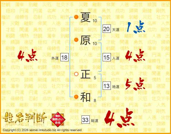 生活面を象徴する運勢です。外部から受ける影響力を表し、結婚運、家庭運や職場、環境への順応性を表します。総運から人運を引いた画数。姓や名が1文字の場合を除く。