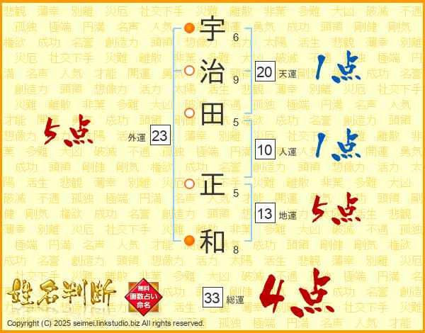 宇(6画)治(9画)田(5画) 正(5画)和(8画)
