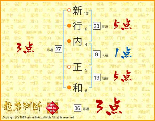 生活面を象徴する運勢です。外部から受ける影響力を表し、結婚運、家庭運や職場、環境への順応性を表します。総運から人運を引いた画数。姓や名が1文字の場合を除く。