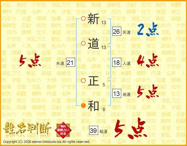 あなたの人生を表す1番重要な運勢です。生涯を通じて影響する総合運となり、主に50歳以降の晩年期に影響を及ぼします。苗字と名前の合計画数。