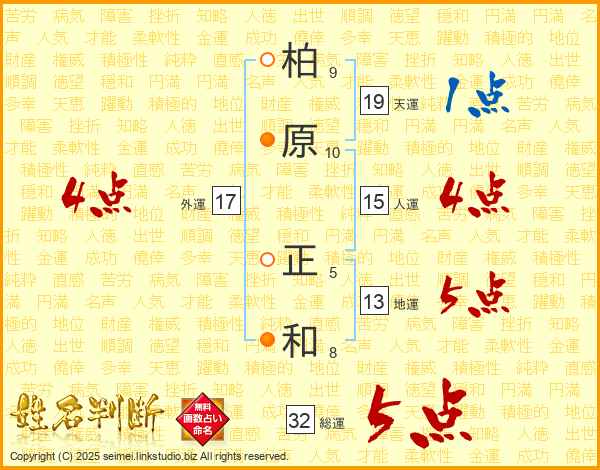 生活面を象徴する運勢です。外部から受ける影響力を表し、結婚運、家庭運や職場、環境への順応性を表します。総運から人運を引いた画数。姓や名が1文字の場合を除く。