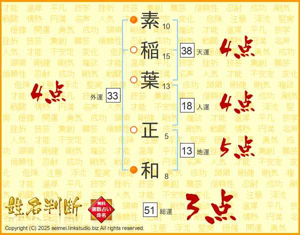 素(10画)稲(15画)葉(13画) 正(5画)和(8画)