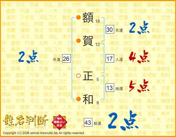 額(18画)賀(12画) 正(5画)和(8画)