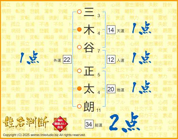 三(3画)木(4画)谷(7画) 正(5画)太(4画)朗(11画)