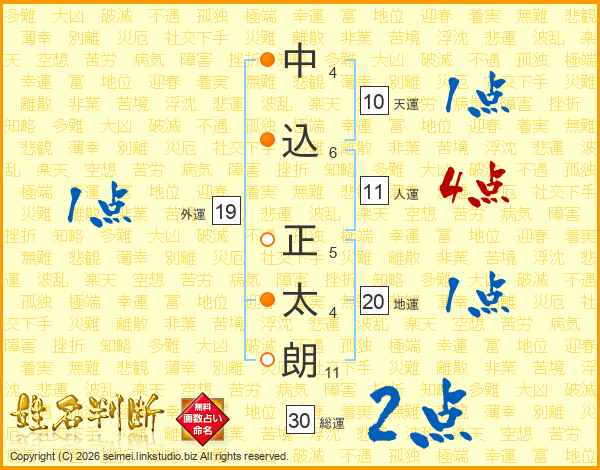 中(4画)込(6画) 正(5画)太(4画)朗(11画)