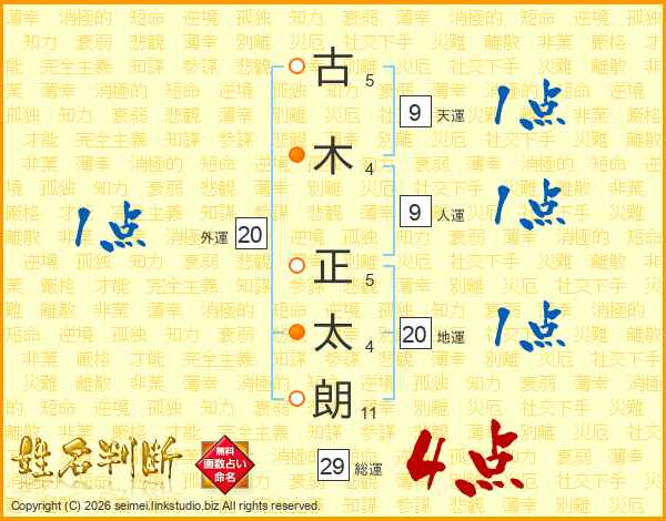 古(5画)木(4画) 正(5画)太(4画)朗(11画)