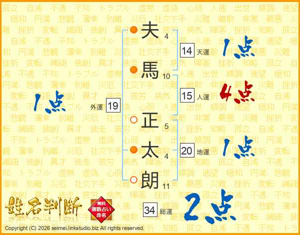 夫(4画)馬(10画) 正(5画)太(4画)朗(11画)