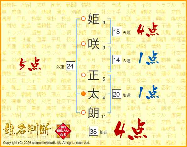 姫(9画)咲(9画) 正(5画)太(4画)朗(11画)