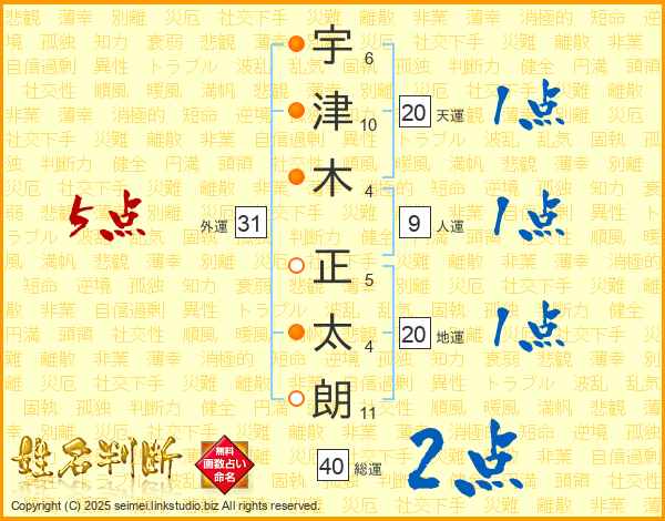 宇(6画)津(10画)木(4画) 正(5画)太(4画)朗(11画)