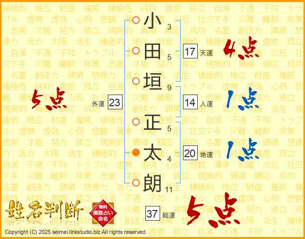 小(3画)田(5画)垣(9画) 正(5画)太(4画)朗(11画)