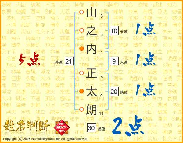 山(3画)之(3画)内(4画) 正(5画)太(4画)朗(11画)