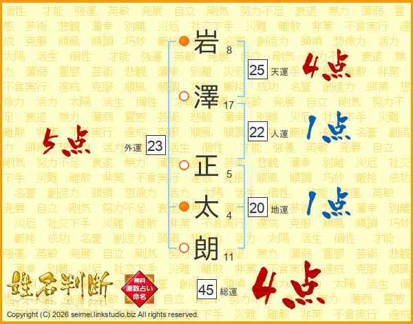 岩(8画)澤(17画) 正(5画)太(4画)朗(11画)