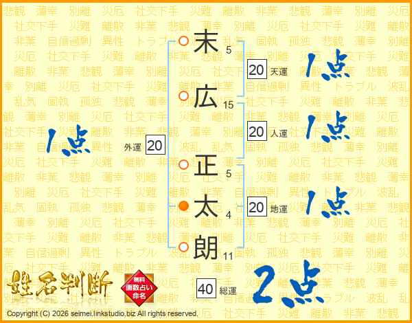 末(5画)広(15画) 正(5画)太(4画)朗(11画)