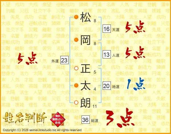 松(8画)岡(8画) 正(5画)太(4画)朗(11画)