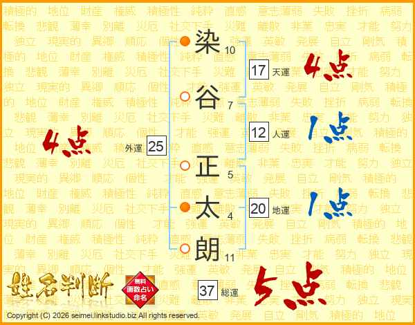 染(10画)谷(7画) 正(5画)太(4画)朗(11画)