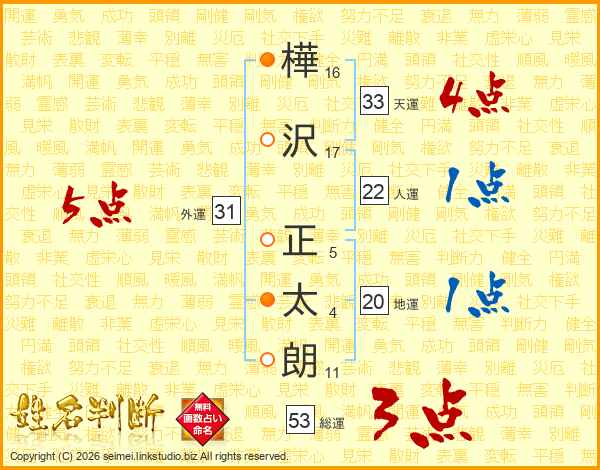 樺(16画)沢(17画) 正(5画)太(4画)朗(11画)