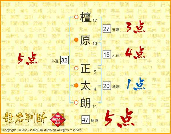檀(17画)原(10画) 正(5画)太(4画)朗(11画)
