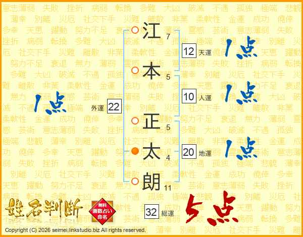 江(7画)本(5画) 正(5画)太(4画)朗(11画)