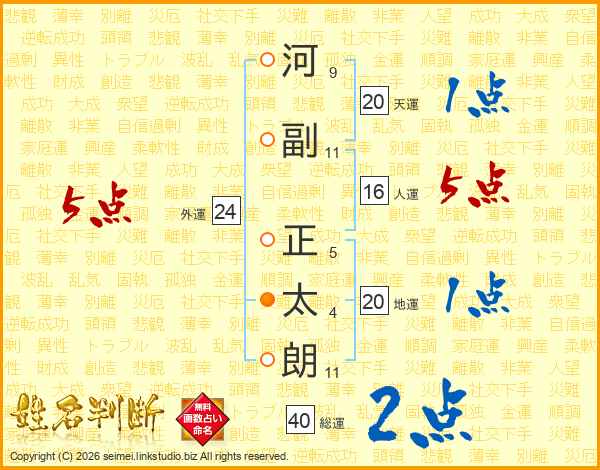 河(9画)副(11画) 正(5画)太(4画)朗(11画)
