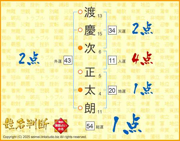 渡(13画)慶(15画)次(6画) 正(5画)太(4画)朗(11画)