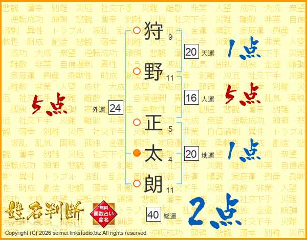 狩(9画)野(11画) 正(5画)太(4画)朗(11画)