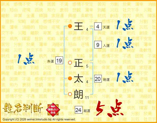 あなたの人生を表す1番重要な運勢です。生涯を通じて影響する総合運となり、主に50歳以降の晩年期に影響を及ぼします。苗字と名前の合計画数。
