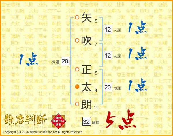 矢(5画)吹(7画) 正(5画)太(4画)朗(11画)