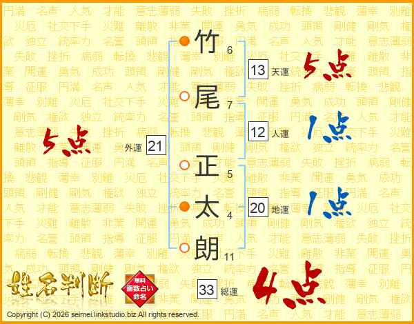 竹(6画)尾(7画) 正(5画)太(4画)朗(11画)