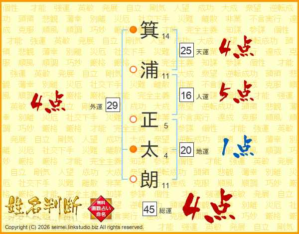 箕(14画)浦(11画) 正(5画)太(4画)朗(11画)