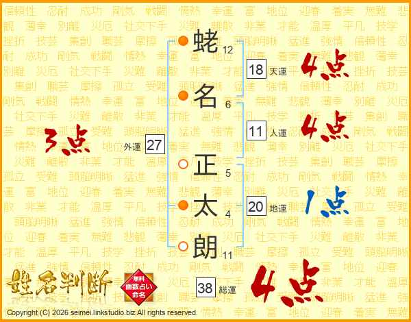 蛯(12画)名(6画) 正(5画)太(4画)朗(11画)