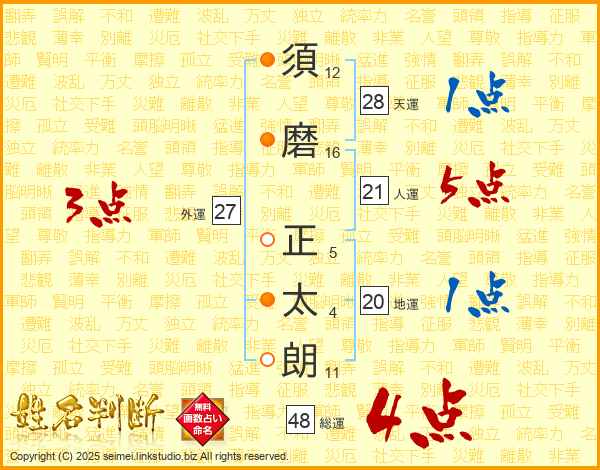 須(12画)磨(16画) 正(5画)太(4画)朗(11画)
