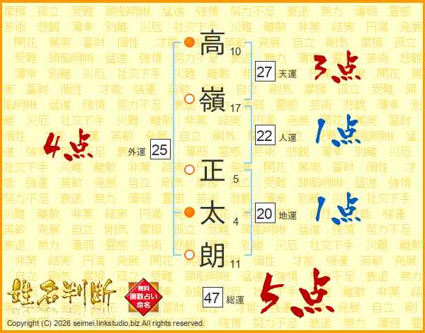 高(10画)嶺(17画) 正(5画)太(4画)朗(11画)