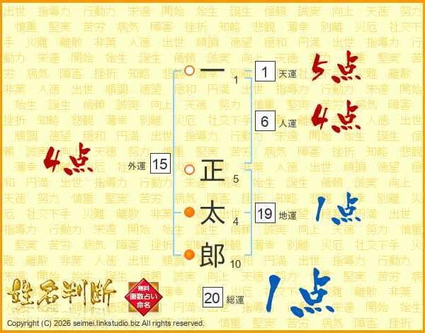 あなたの人生を表す1番重要な運勢です。生涯を通じて影響する総合運となり、主に50歳以降の晩年期に影響を及ぼします。苗字と名前の合計画数。