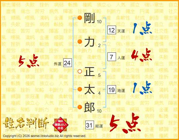 剛(10画)力(2画) 正(5画)太(4画)郎(10画)