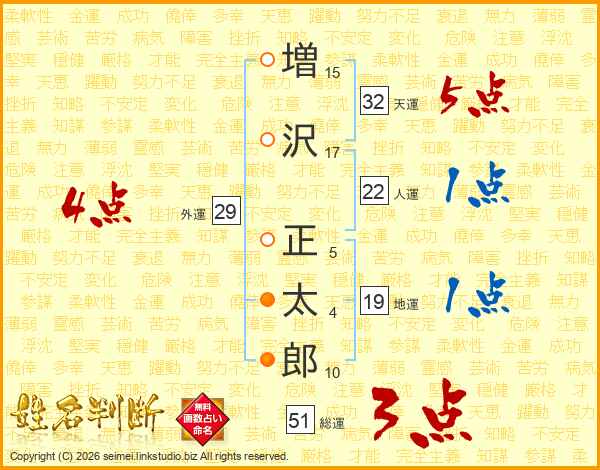 増(15画)沢(17画) 正(5画)太(4画)郎(10画)