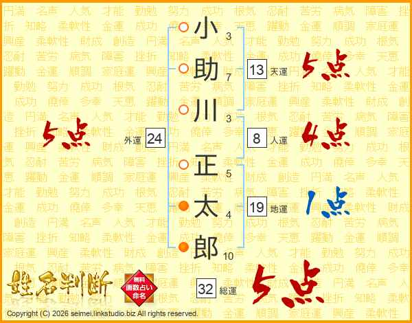 小(3画)助(7画)川(3画) 正(5画)太(4画)郎(10画)