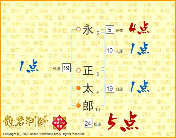 あなたの人生を表す1番重要な運勢です。生涯を通じて影響する総合運となり、主に50歳以降の晩年期に影響を及ぼします。苗字と名前の合計画数。